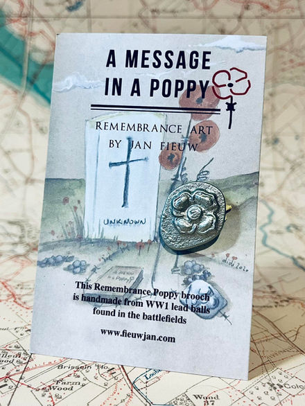 The suffering of the Great War has been reshaped and reborn into a unique piece of art. This commemorative poppy is handcrafted from authentic lead shrapnel balls, recovered from the historic battlefields of Flanders and France.